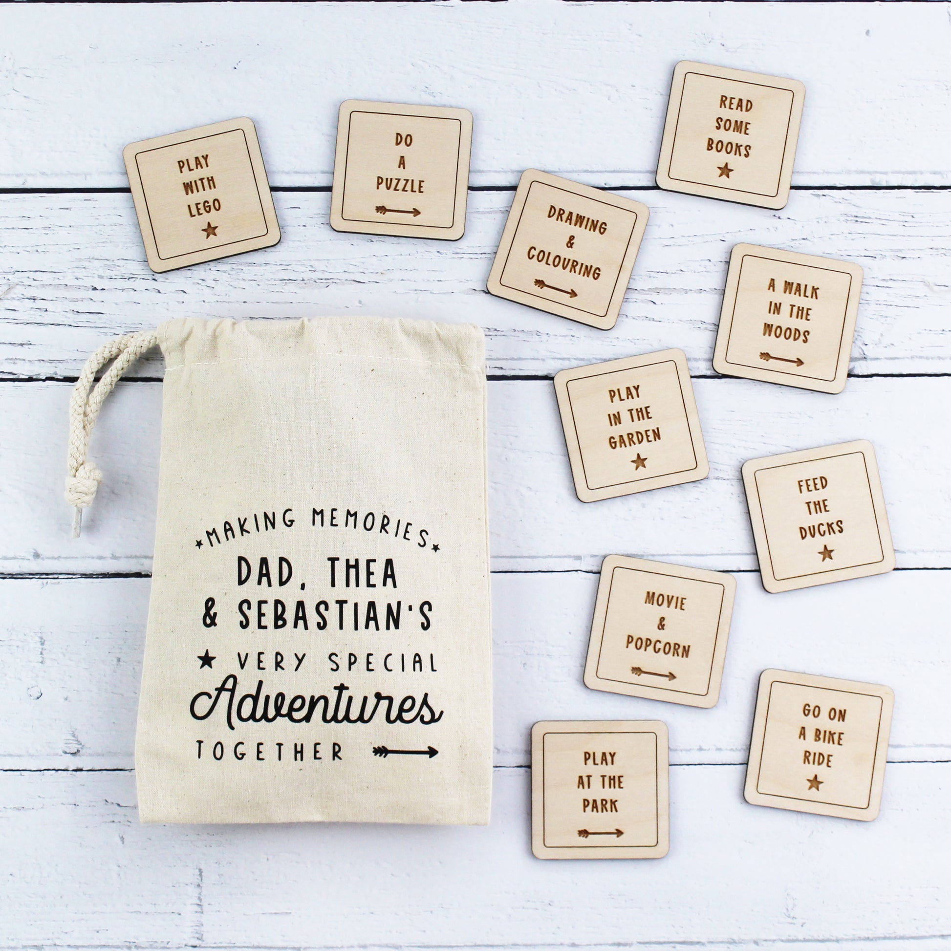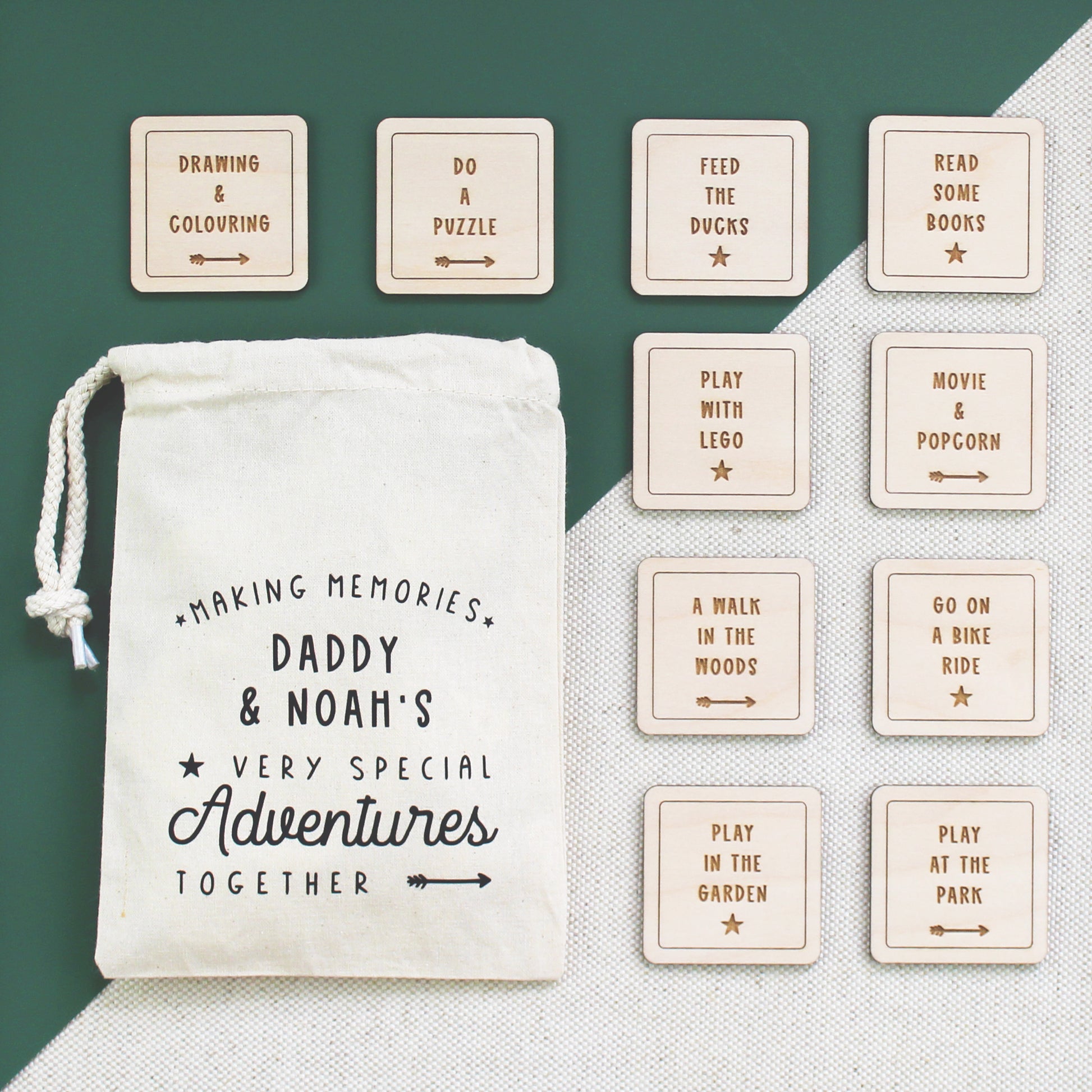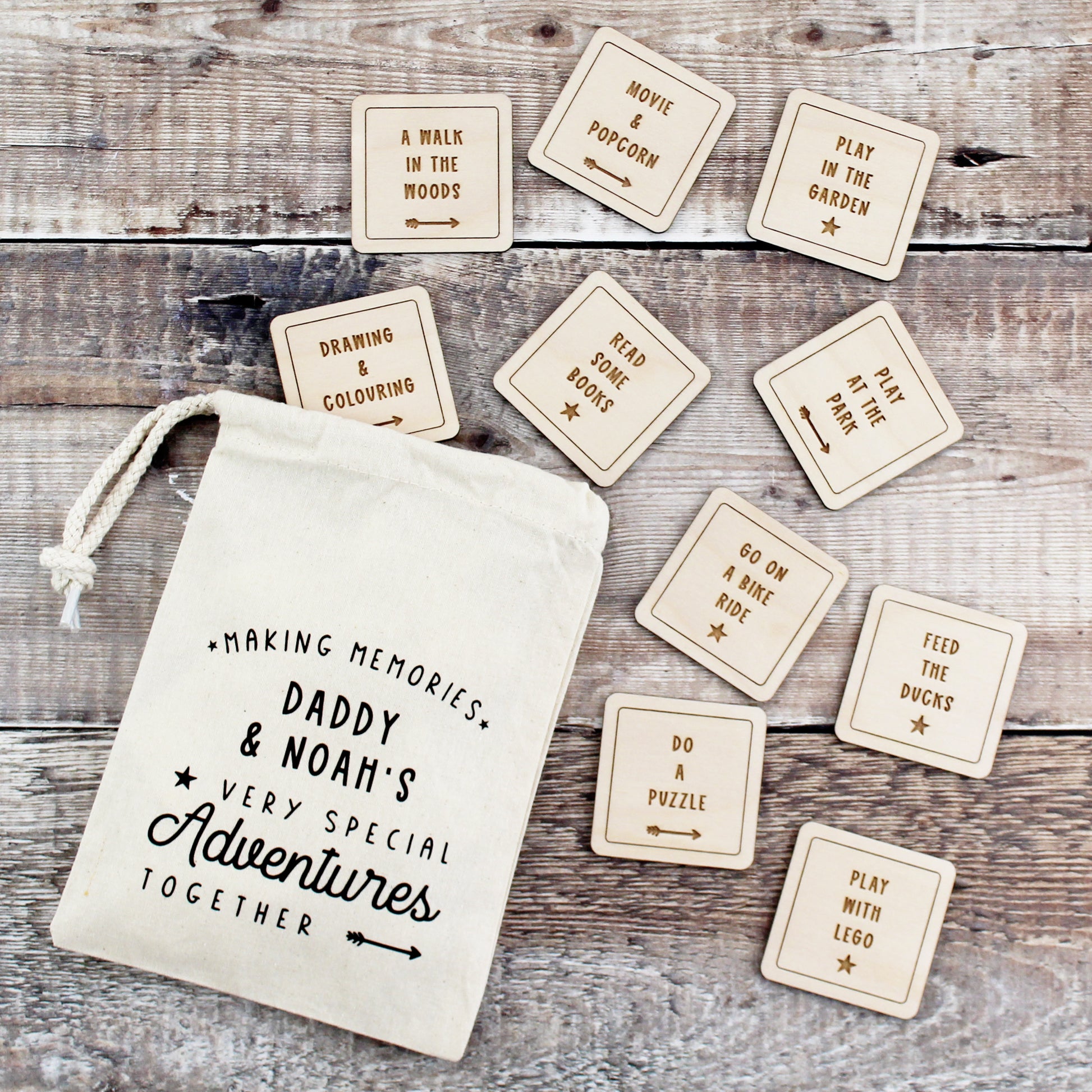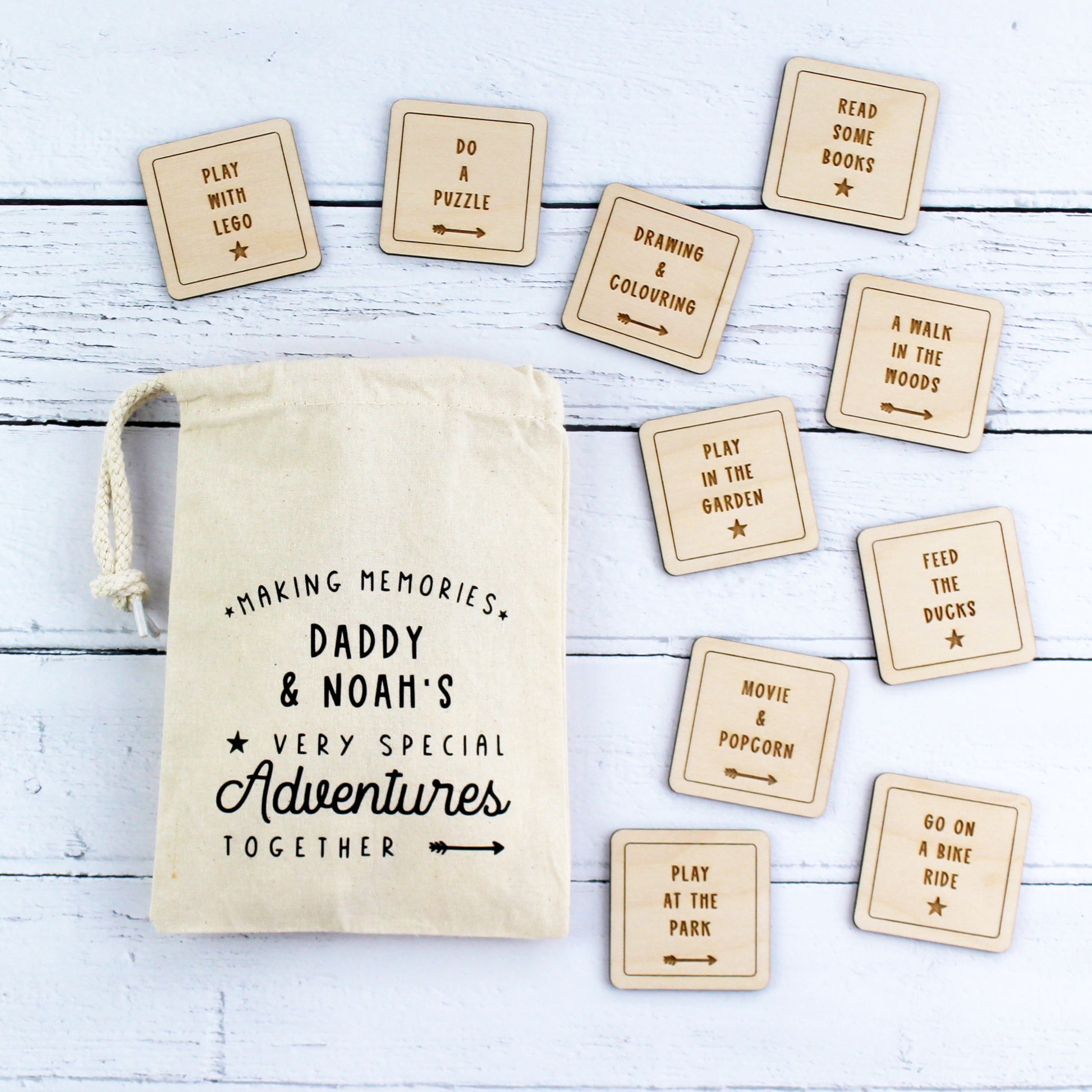 A great way to encourage making memories, this gorgeous set of wooden tokens are each personalised with an adventure of your choice. A fun way for Daddy and child to choose what to do when spending time together and/or to help remember their best adventures.