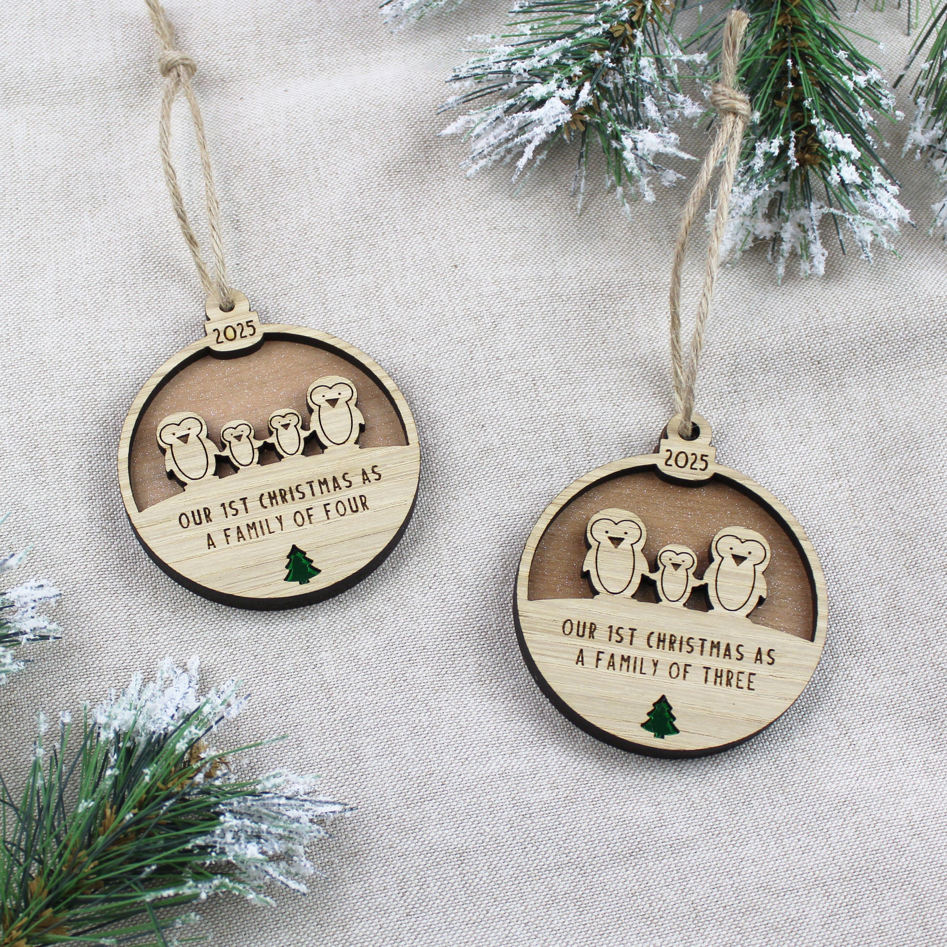 The penguins are cut out of the top layer of wood, and the glittery wooden base layer shows through giving a wonderful 2D effect. The green acrylic tree adds a little burst of festive shine underneath the personalised engraving.