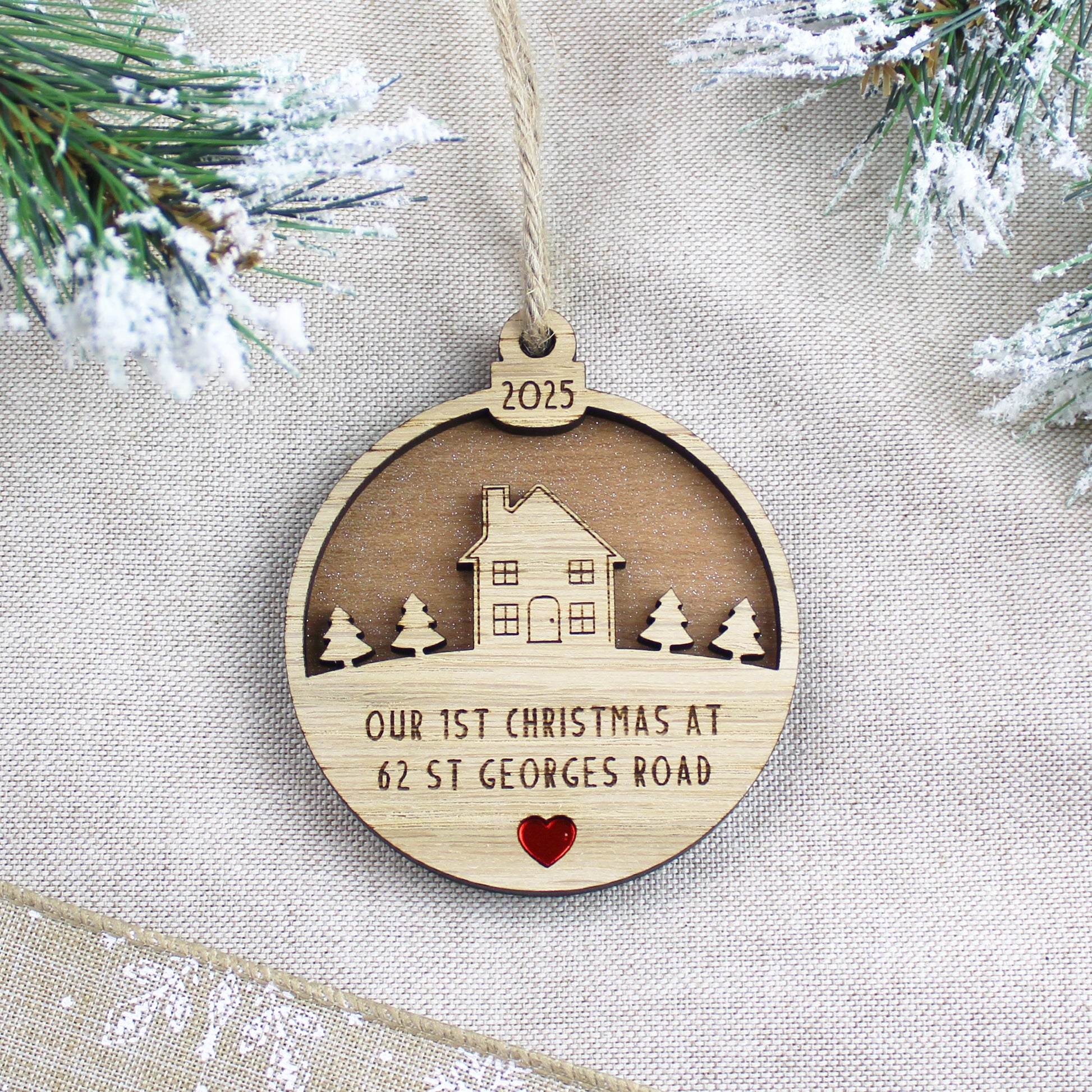 A wooden tree decoration that will be a lovely keepsake gift to remember the First Christmas in a new home.