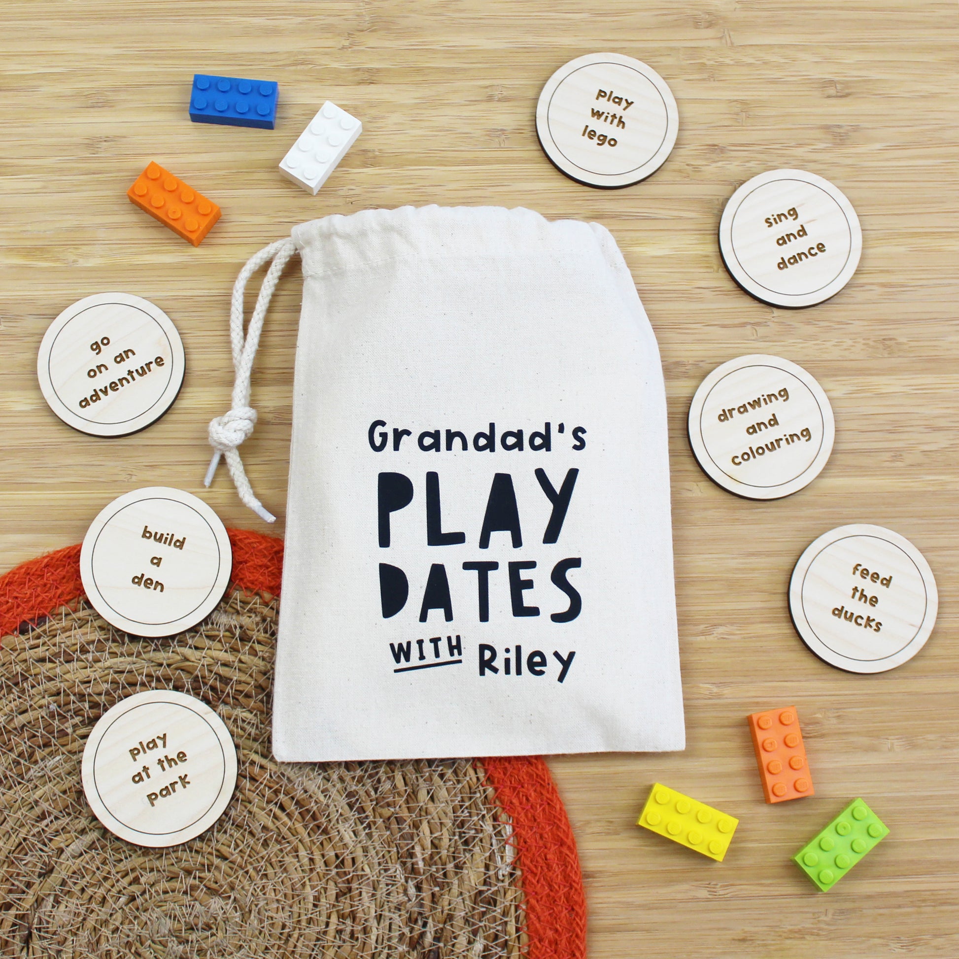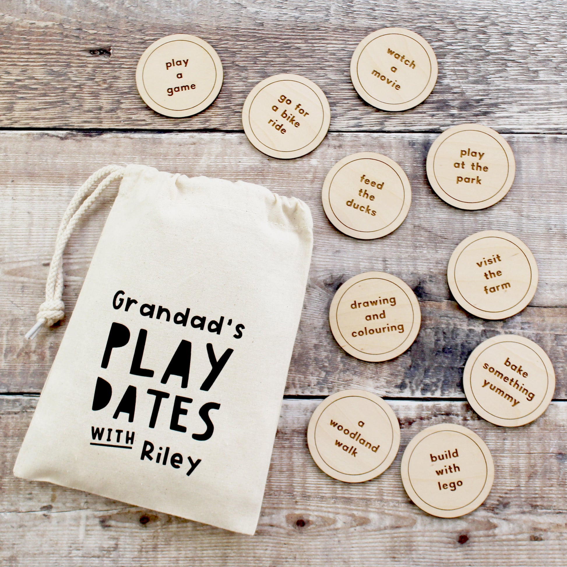 A great way to encourage quality time, this gorgeous set of wooden tokens are each personalised with an activity of your choice. A fun way for Grandad and grandchild to choose what to do when spending time together and/or as a keepsake to remember their very special play dates together.