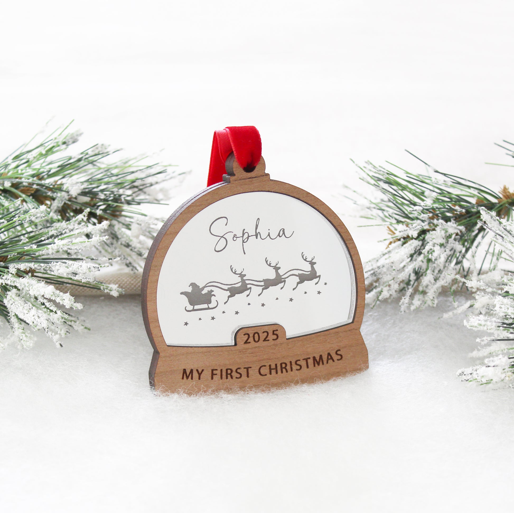 Celebrate a new little one's very first Christmas with our stunning snow globe style bauble that is handmade from wood and silver mirror acrylic and finished with red velvet ribbon.