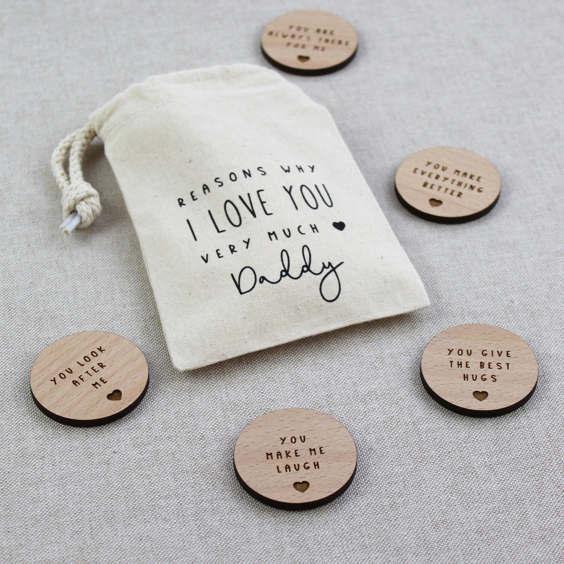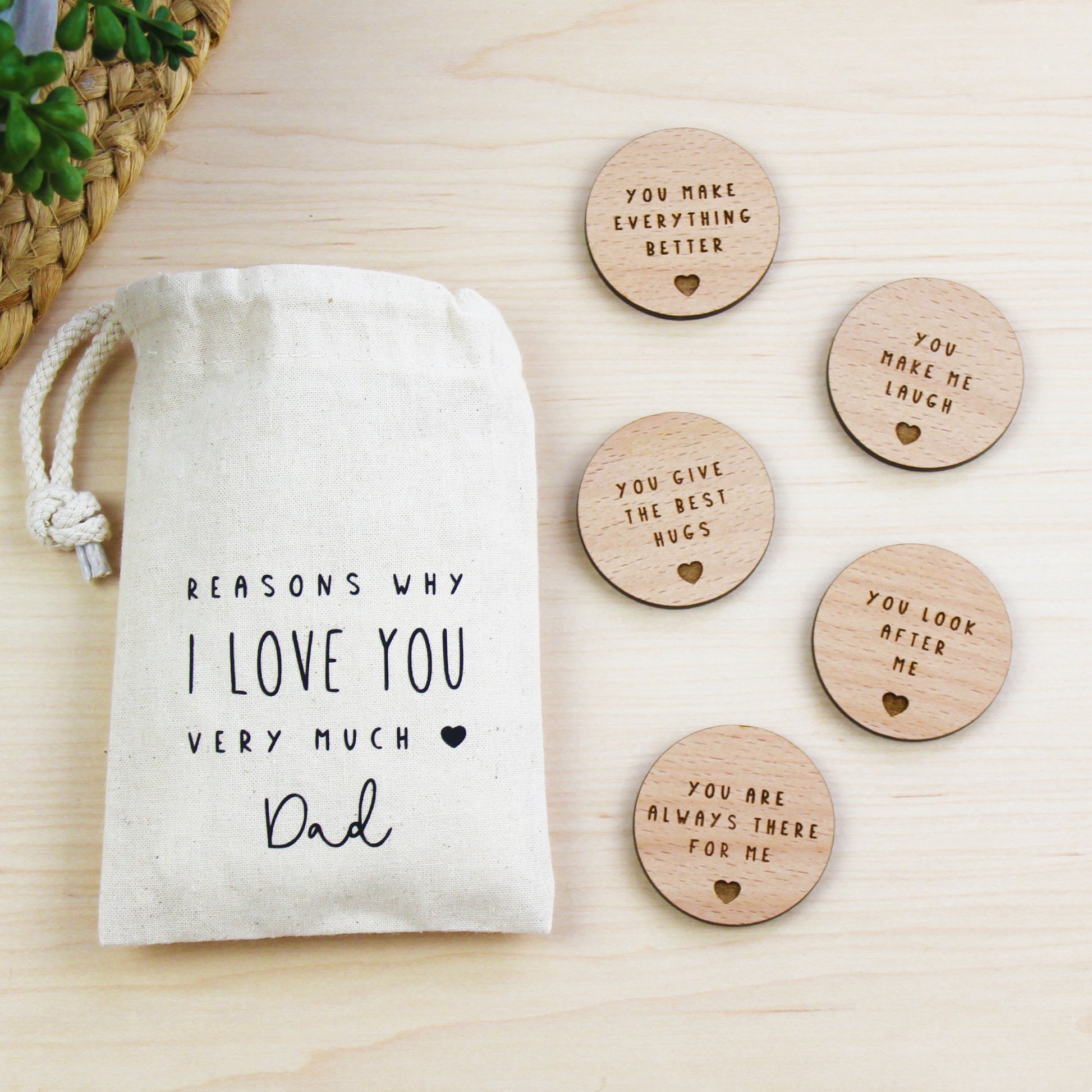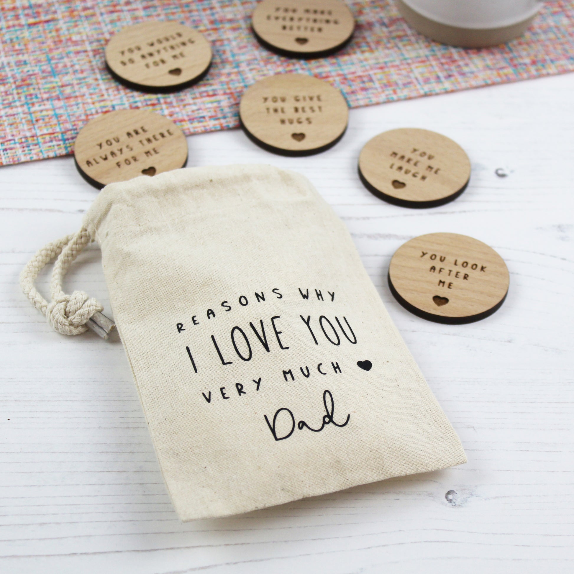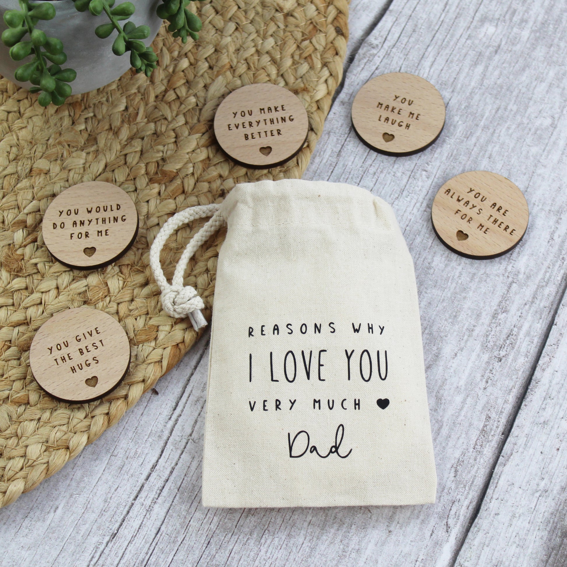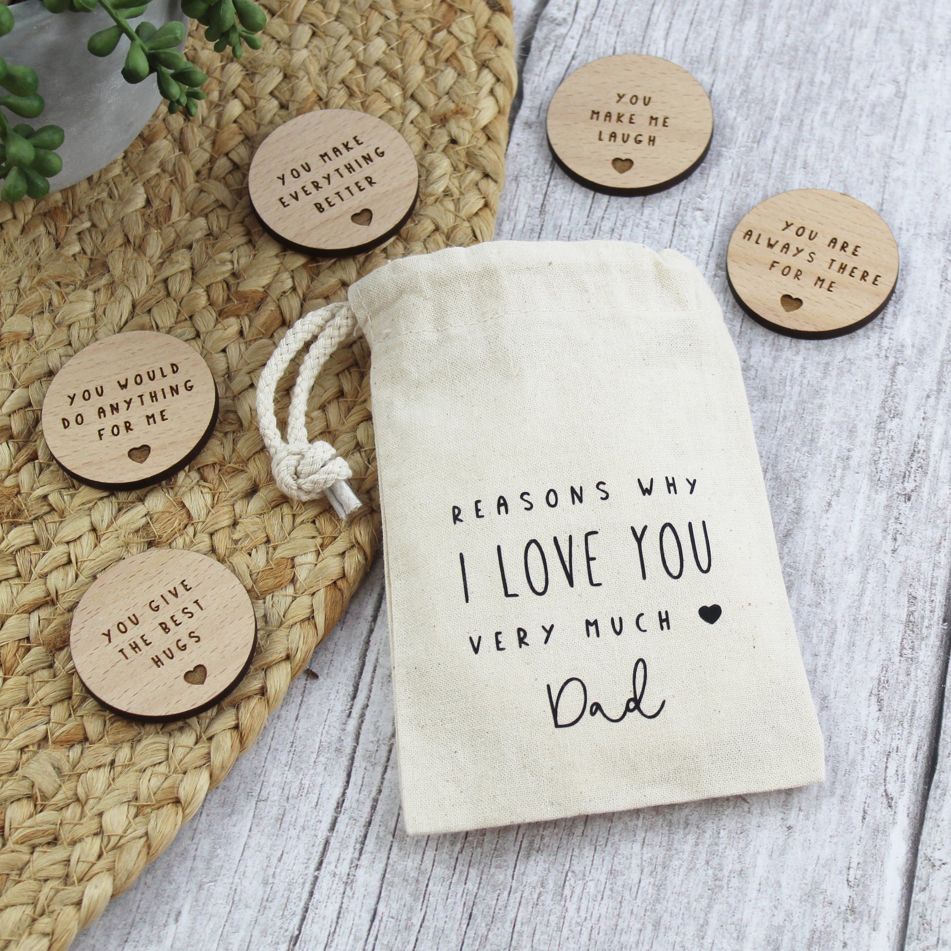 The cotton bag is personalised for Dad, Daddy or any special name he has, and includes up to 10 wooden tokens that are each engraved with a reason of your choice - so you can include all of the special reasons why you love him.