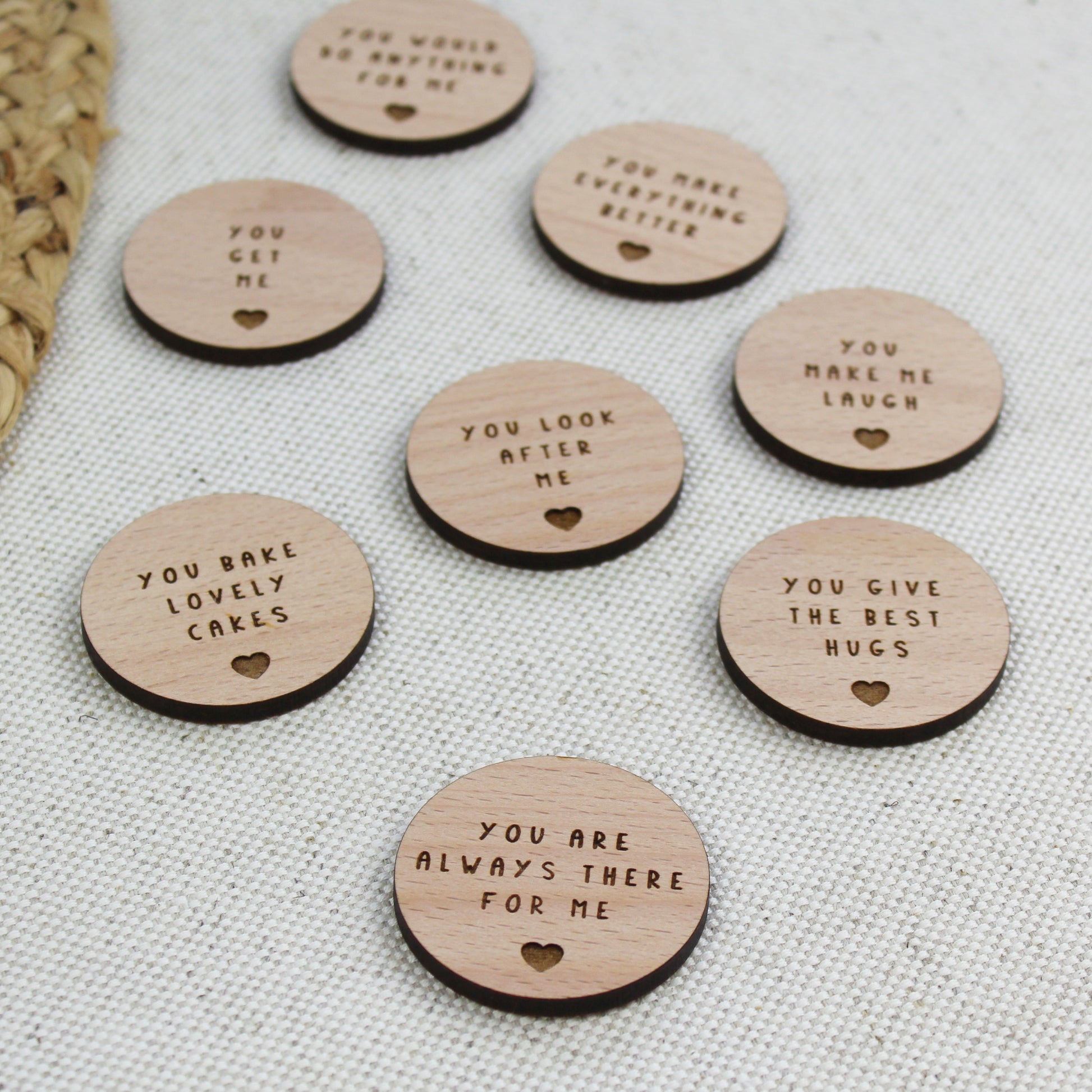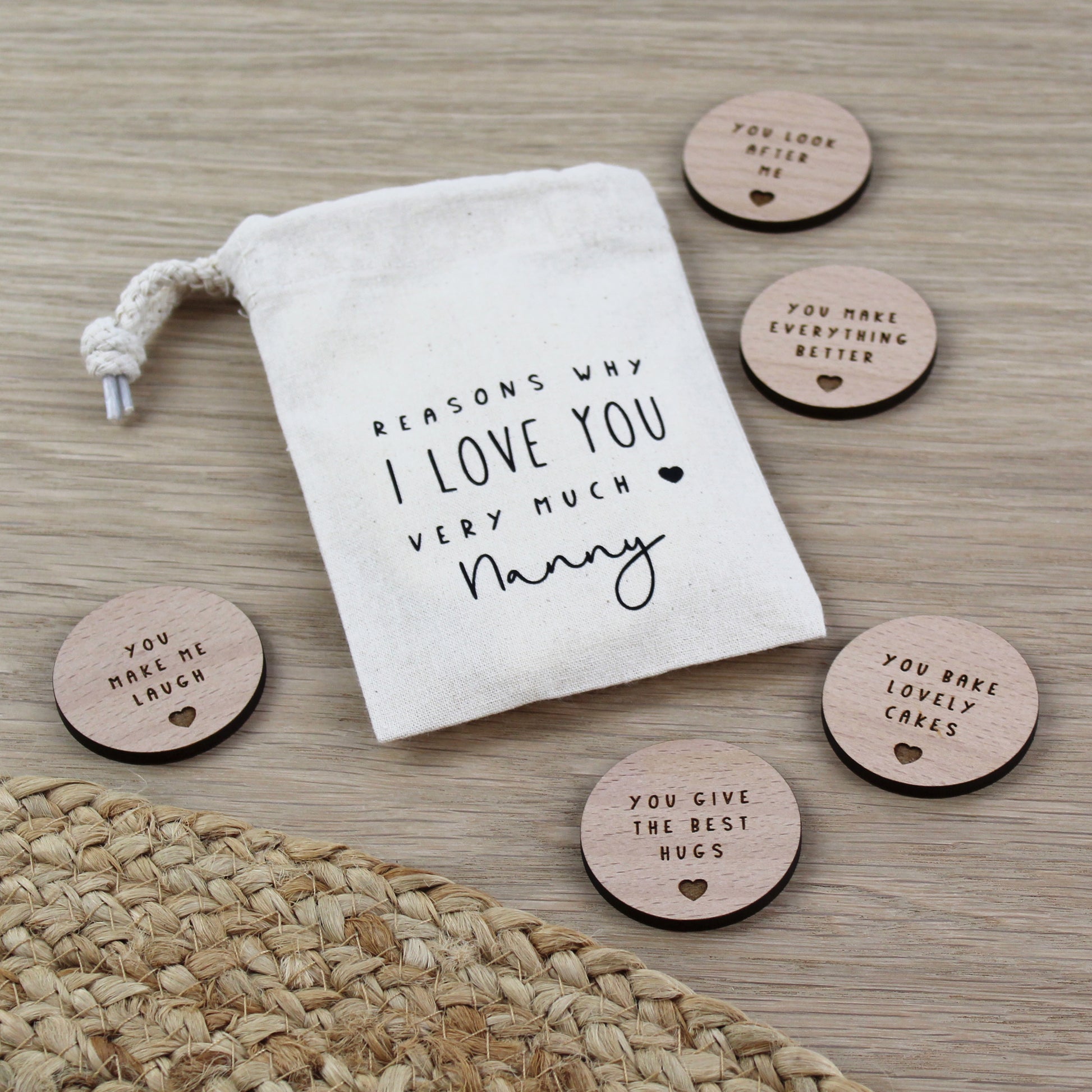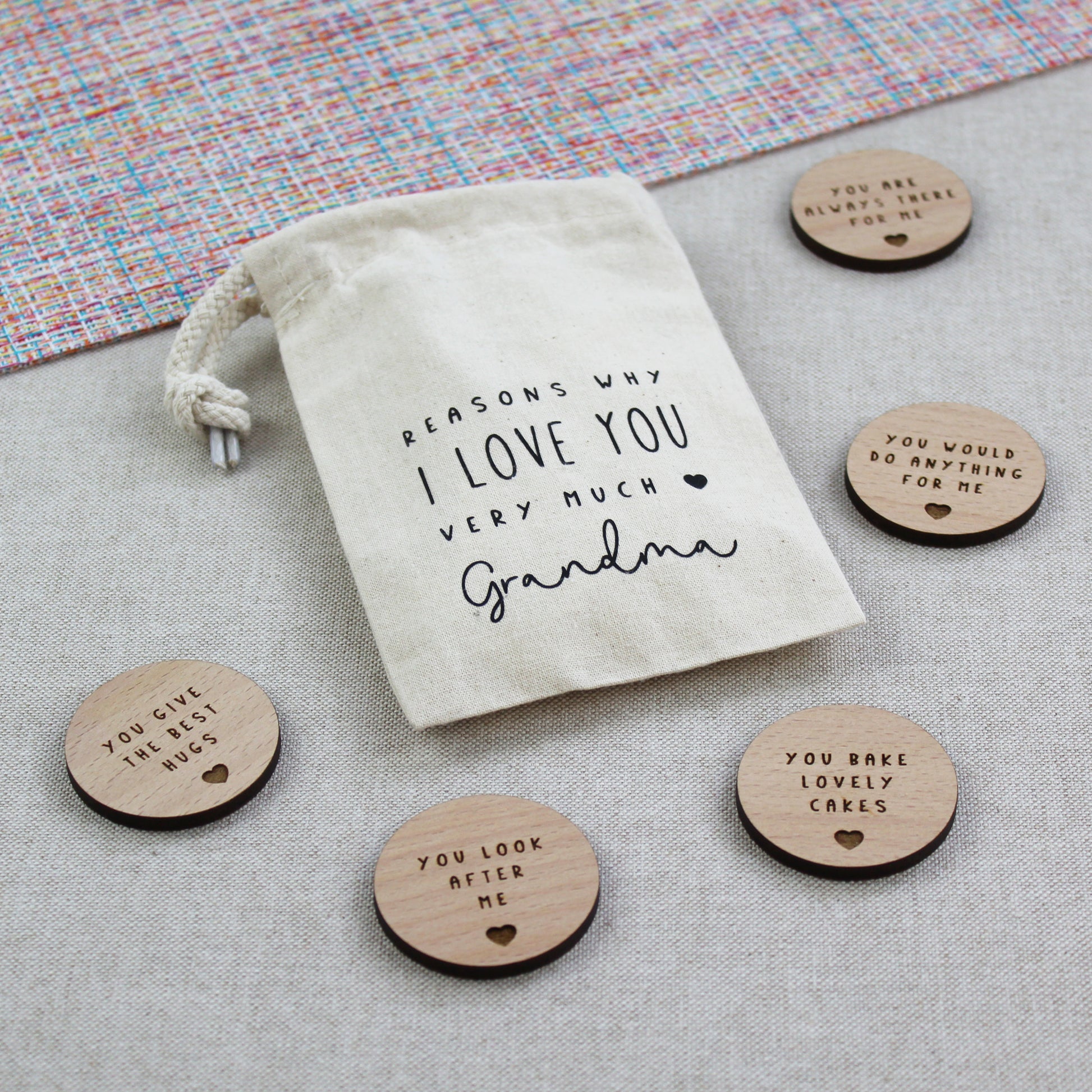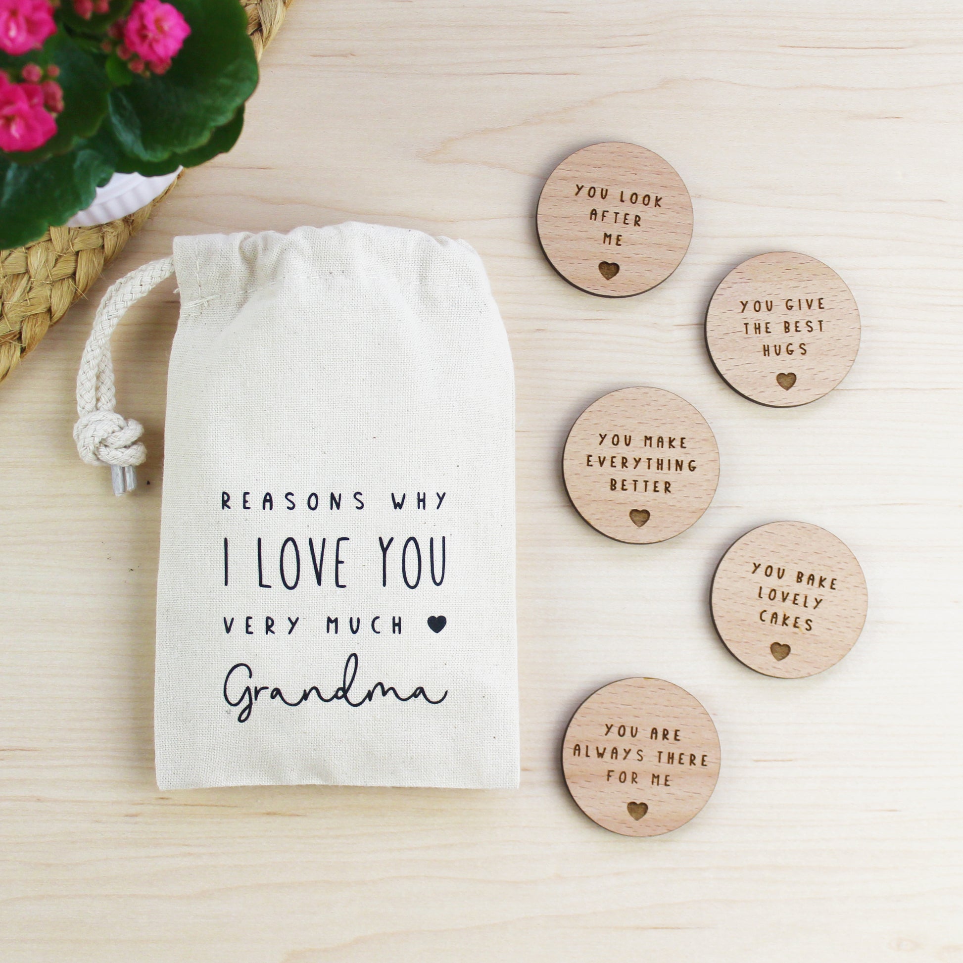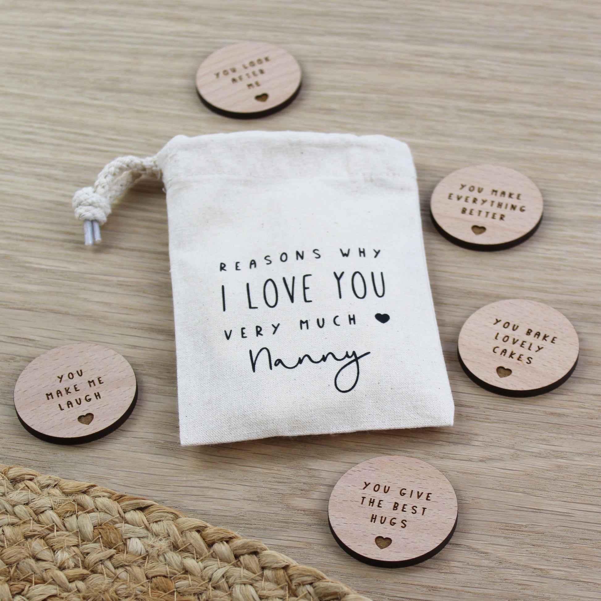 The cotton bag is personalised for Grandma, Nanny or any special name she has, and includes up to 10 wooden tokens that are each engraved with a reason of your choice - so you can include all of the special reasons why you love her.