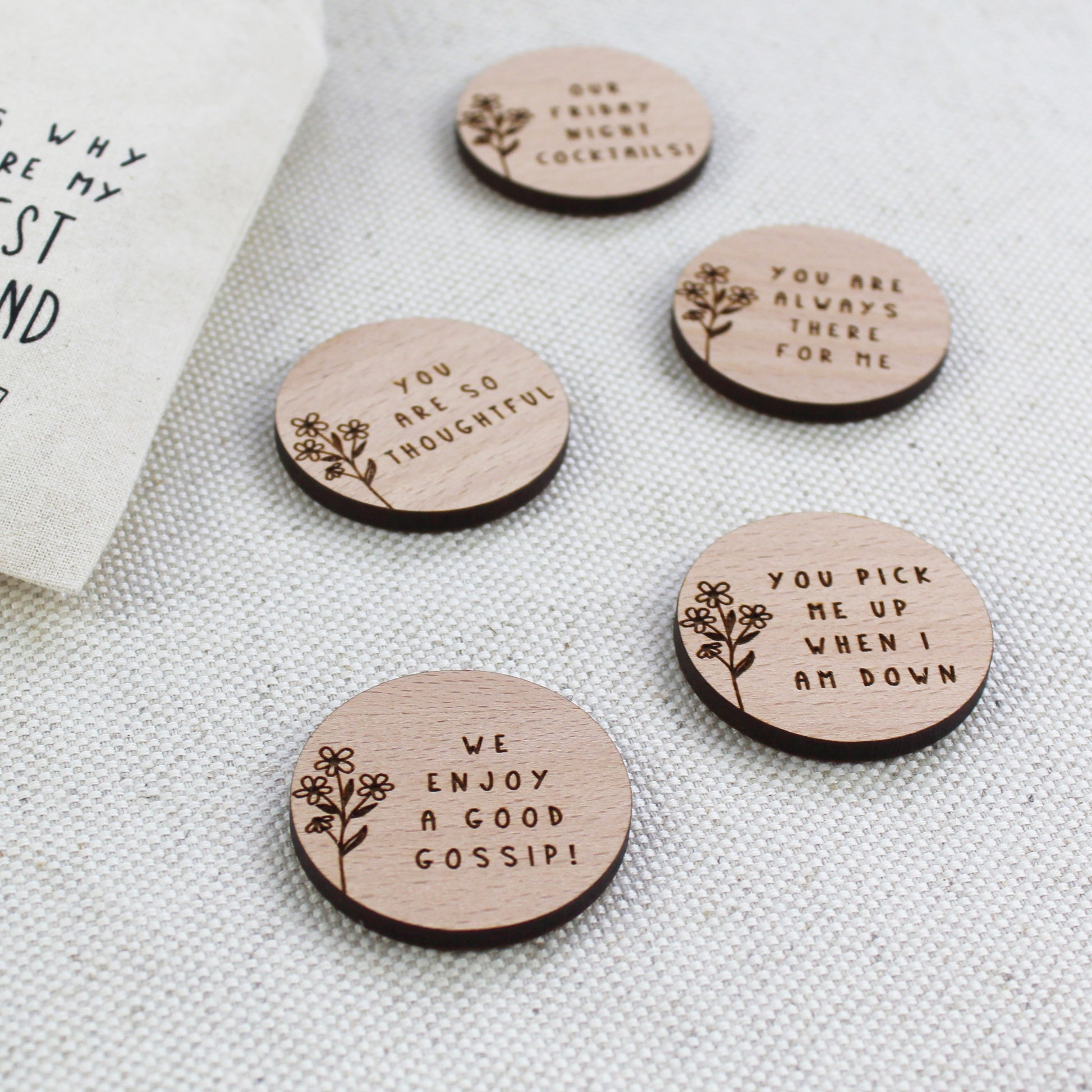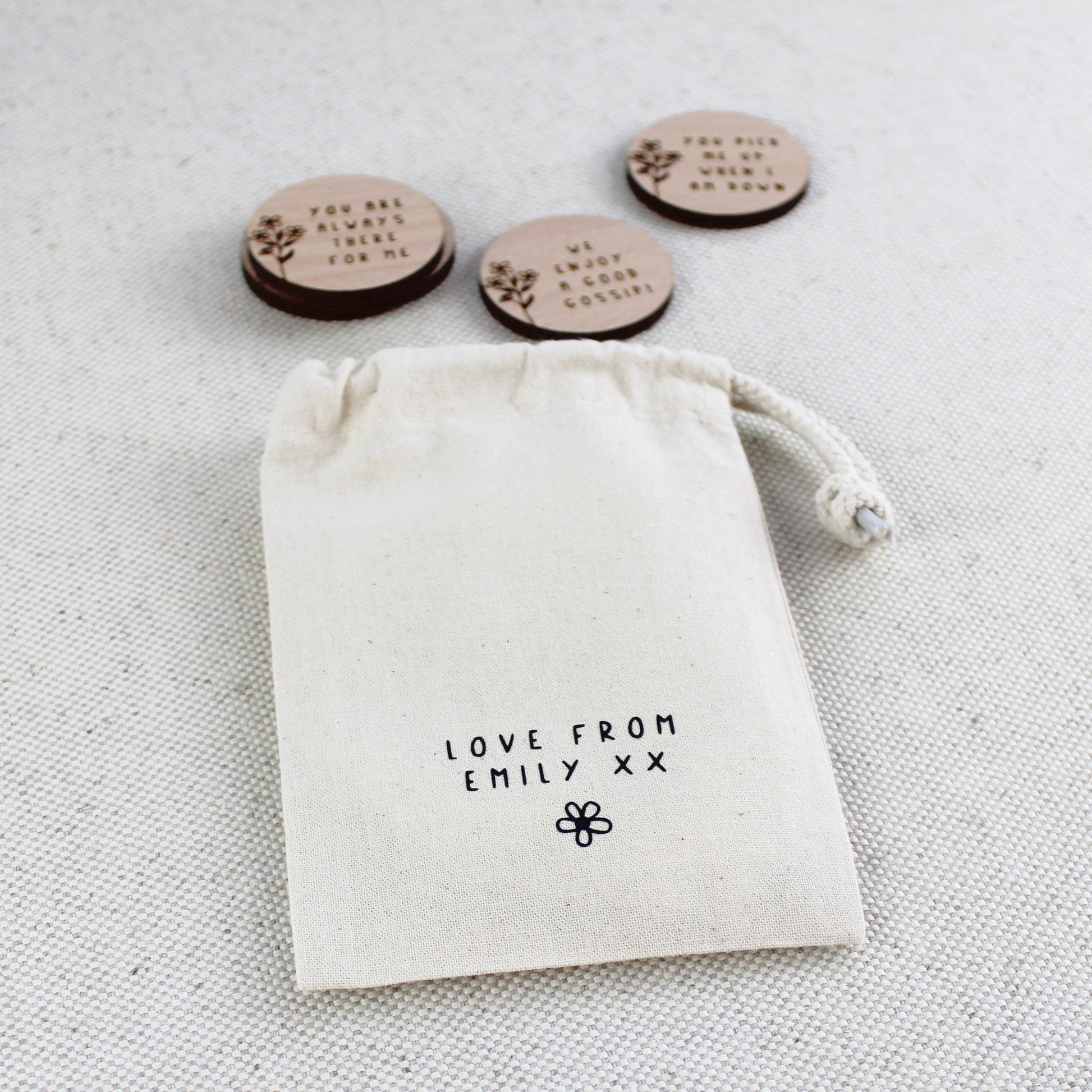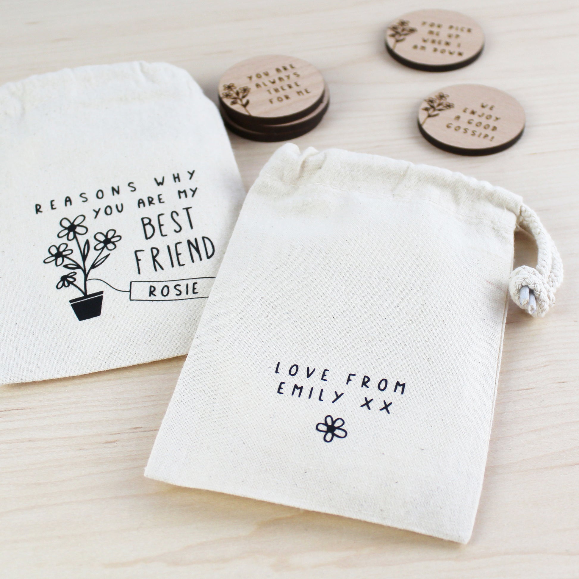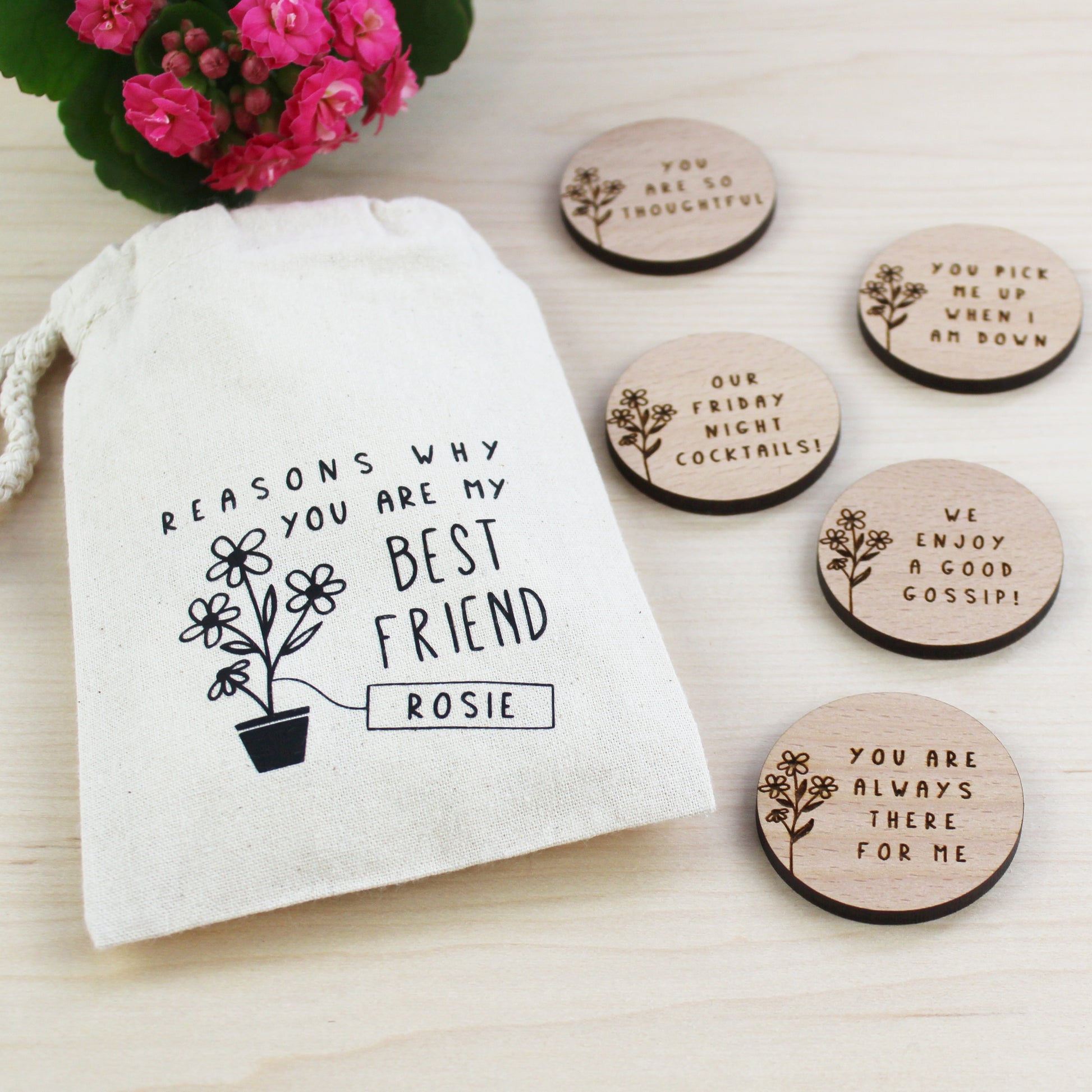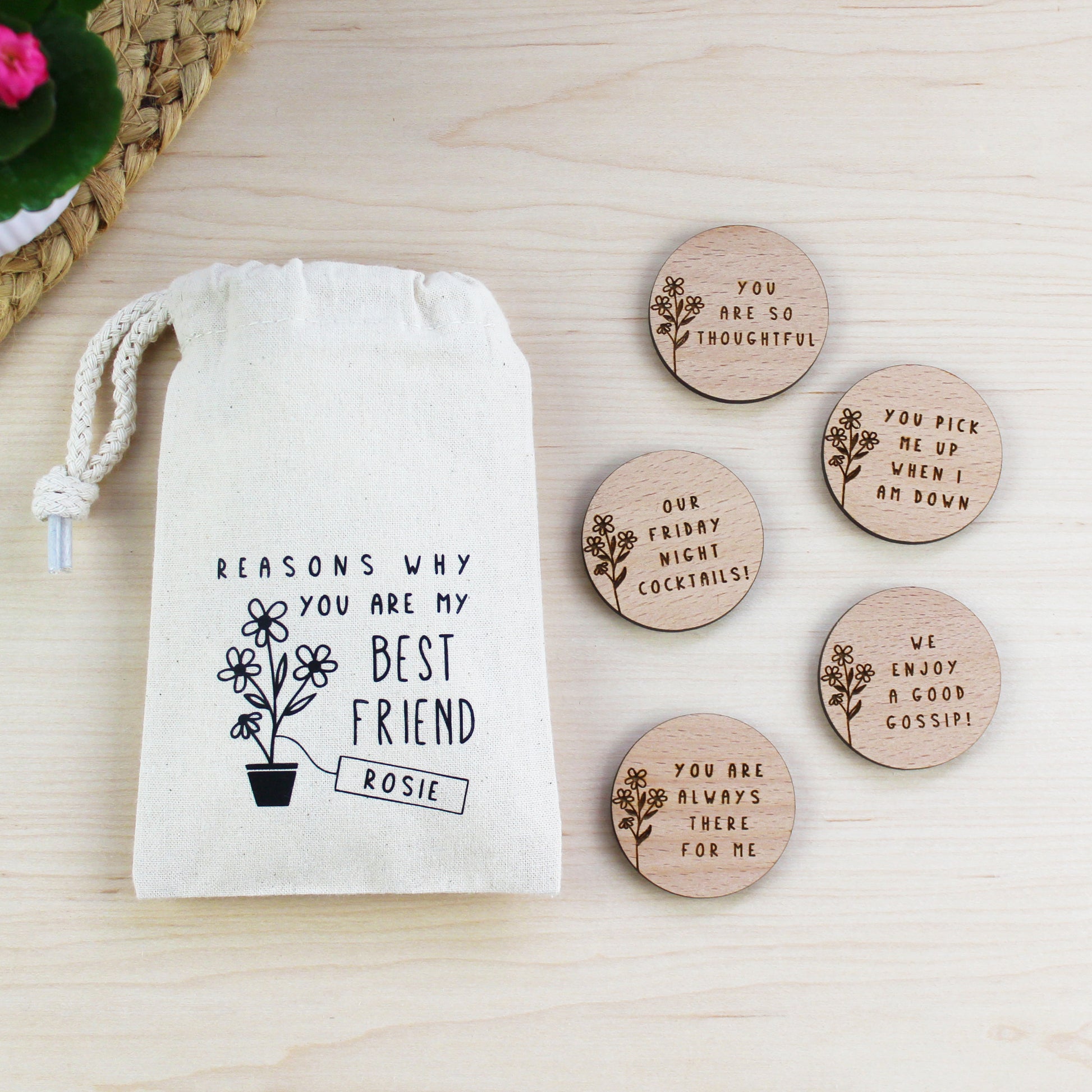 The cotton bag is personalised with your best friends name, and includes up to 10 wooden tokens that are each engraved with a reason of your choice - so you can include all of the special reasons why your friendship means so much.