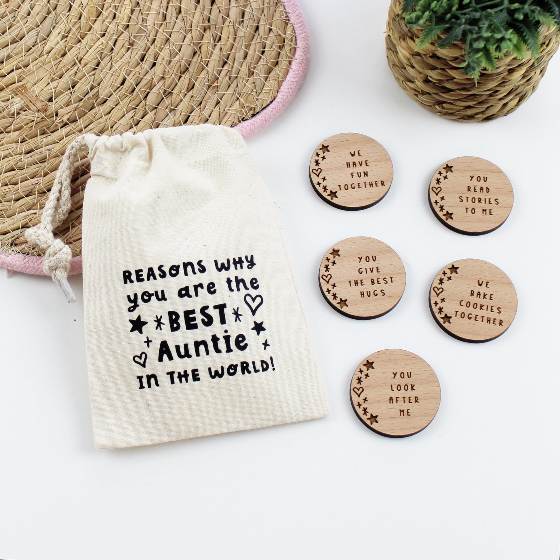 Let Mum know just how special she his with this lovely little set that includes up to 10 wooden tokens engraved with your very own reasons why they are the best Auntie in the world!