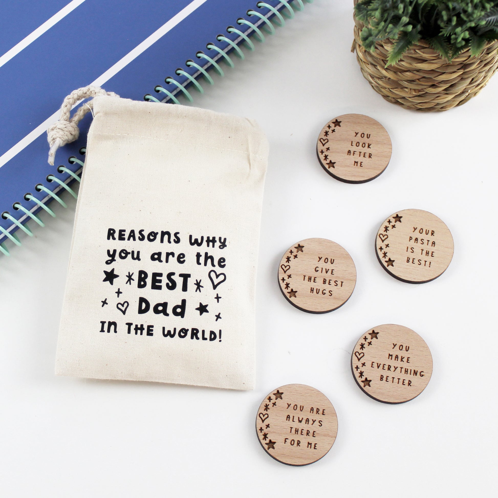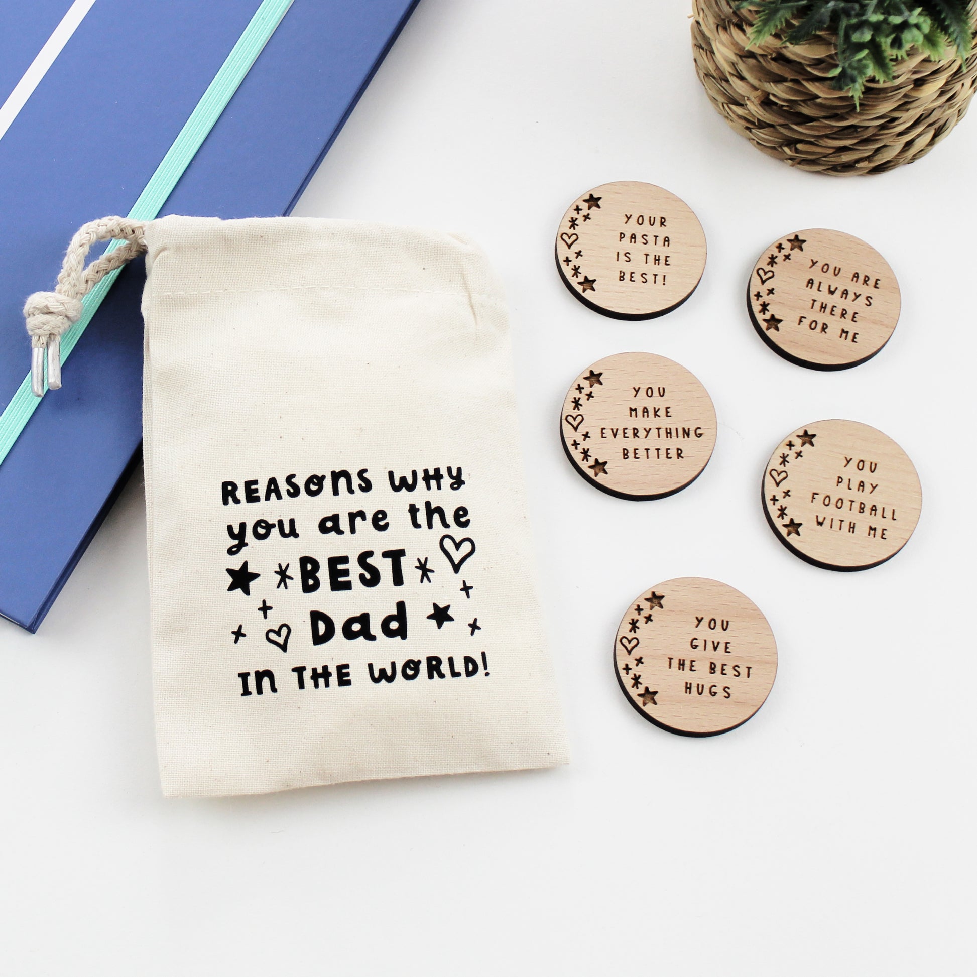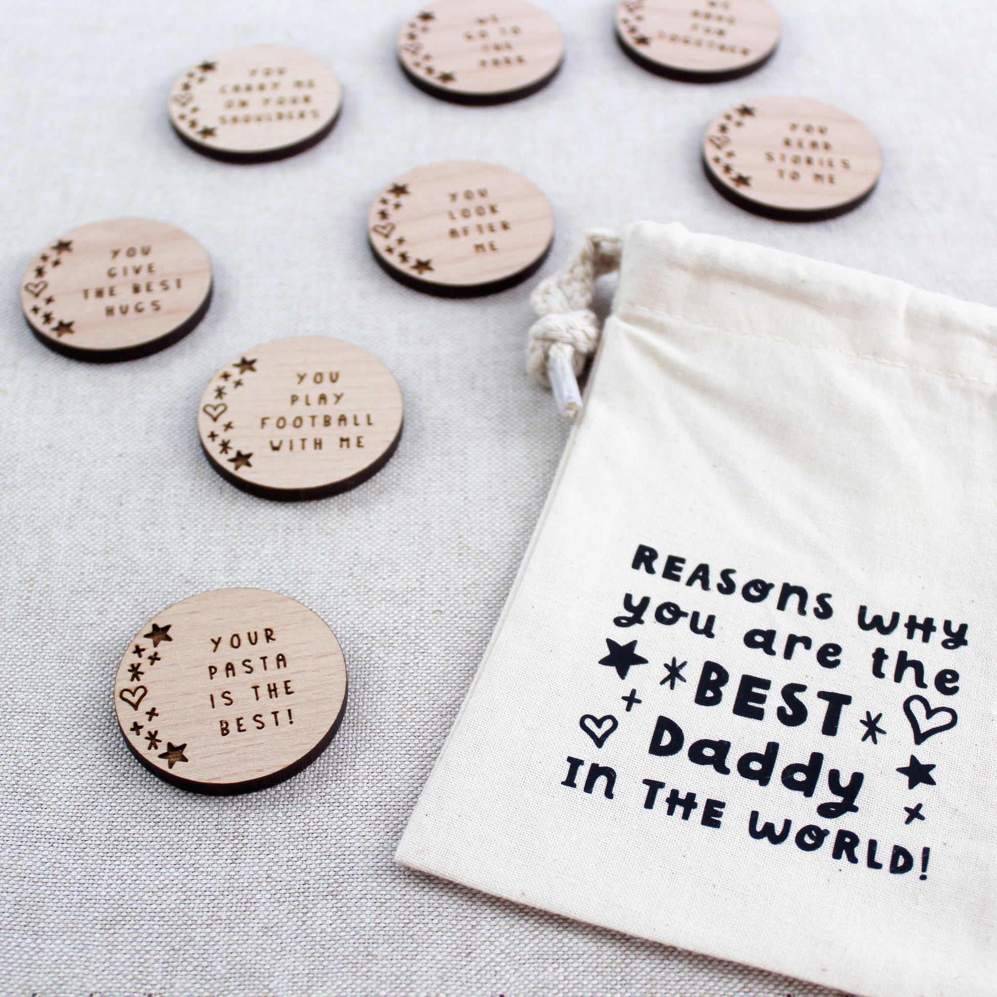 Let Dad know just how special he his with this lovely little set that includes up to 10 wooden tokens engraved with your very own reasons why they are the best Dad in the world!