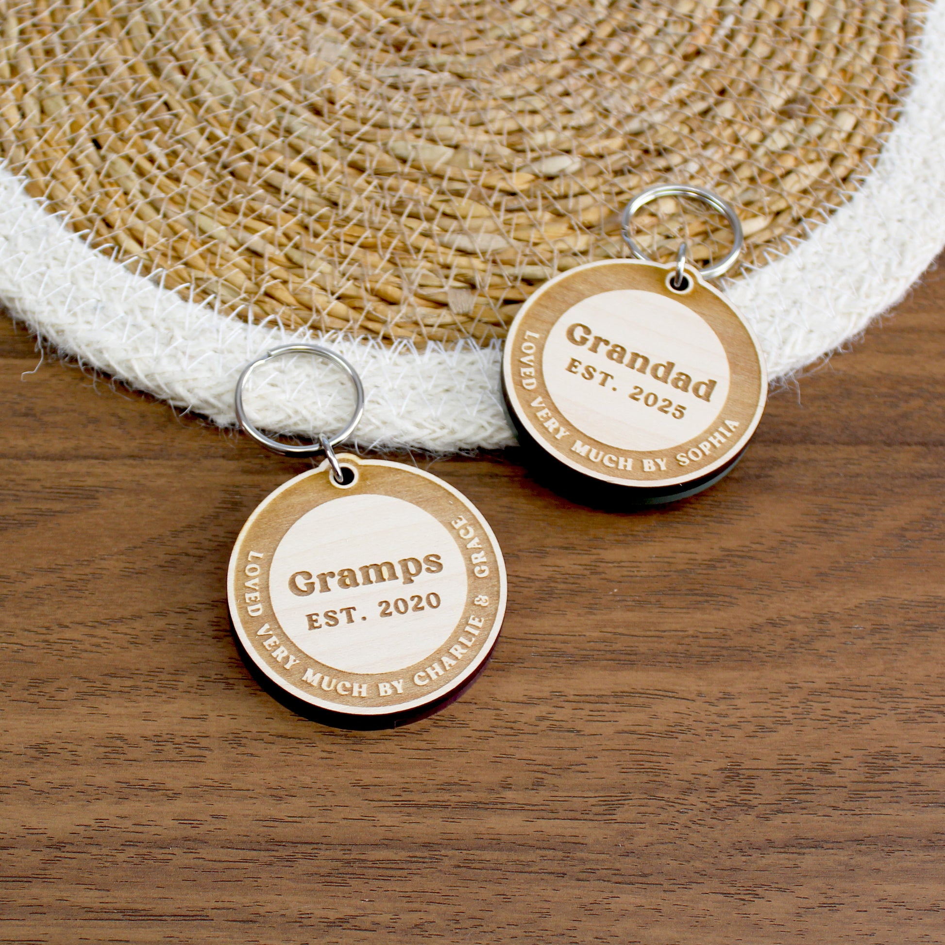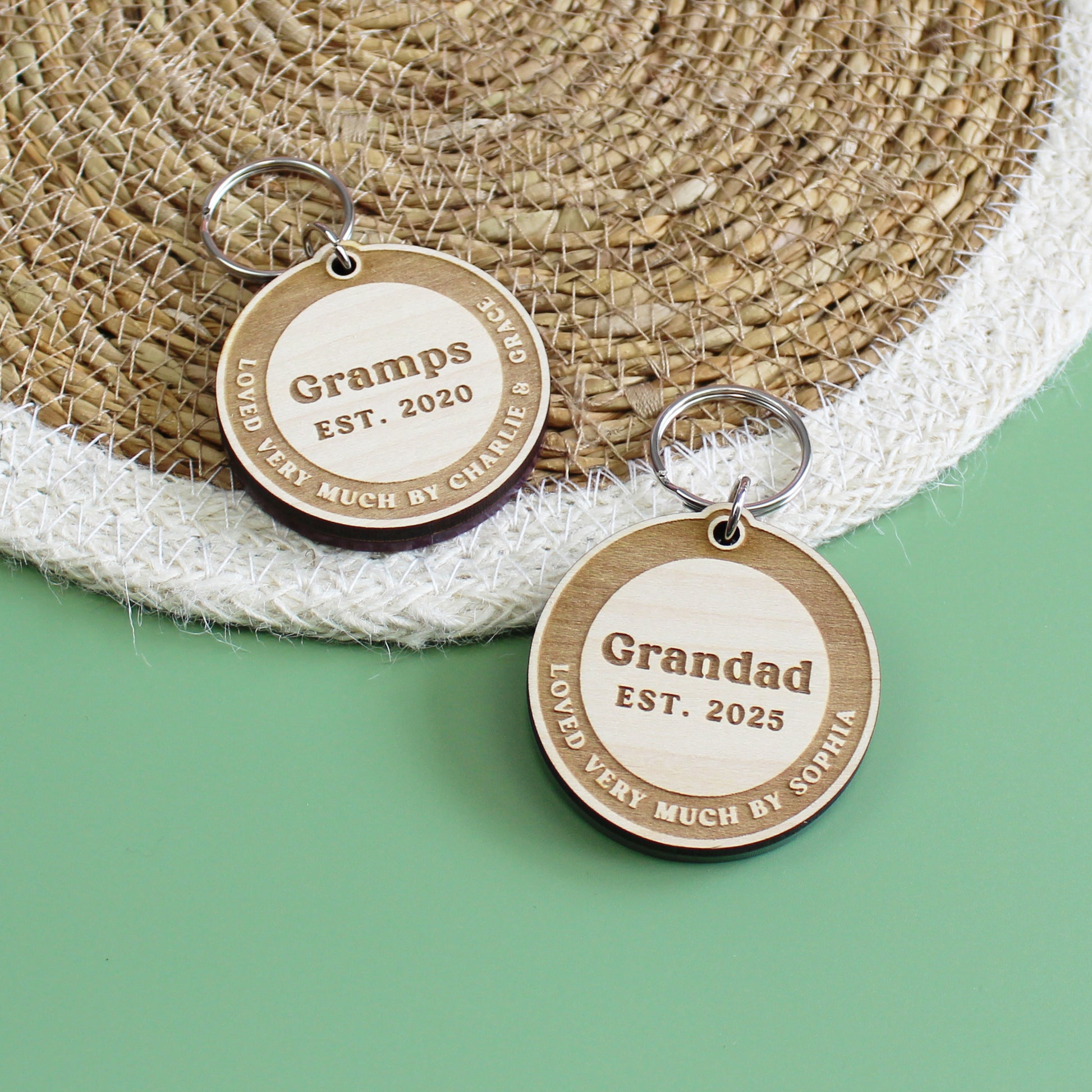 The keyring includes their name, the year they were established as a Grandad plus a sweet message that includes his child or children's names too.