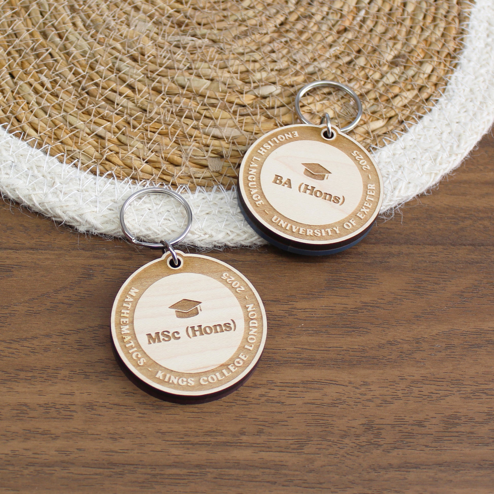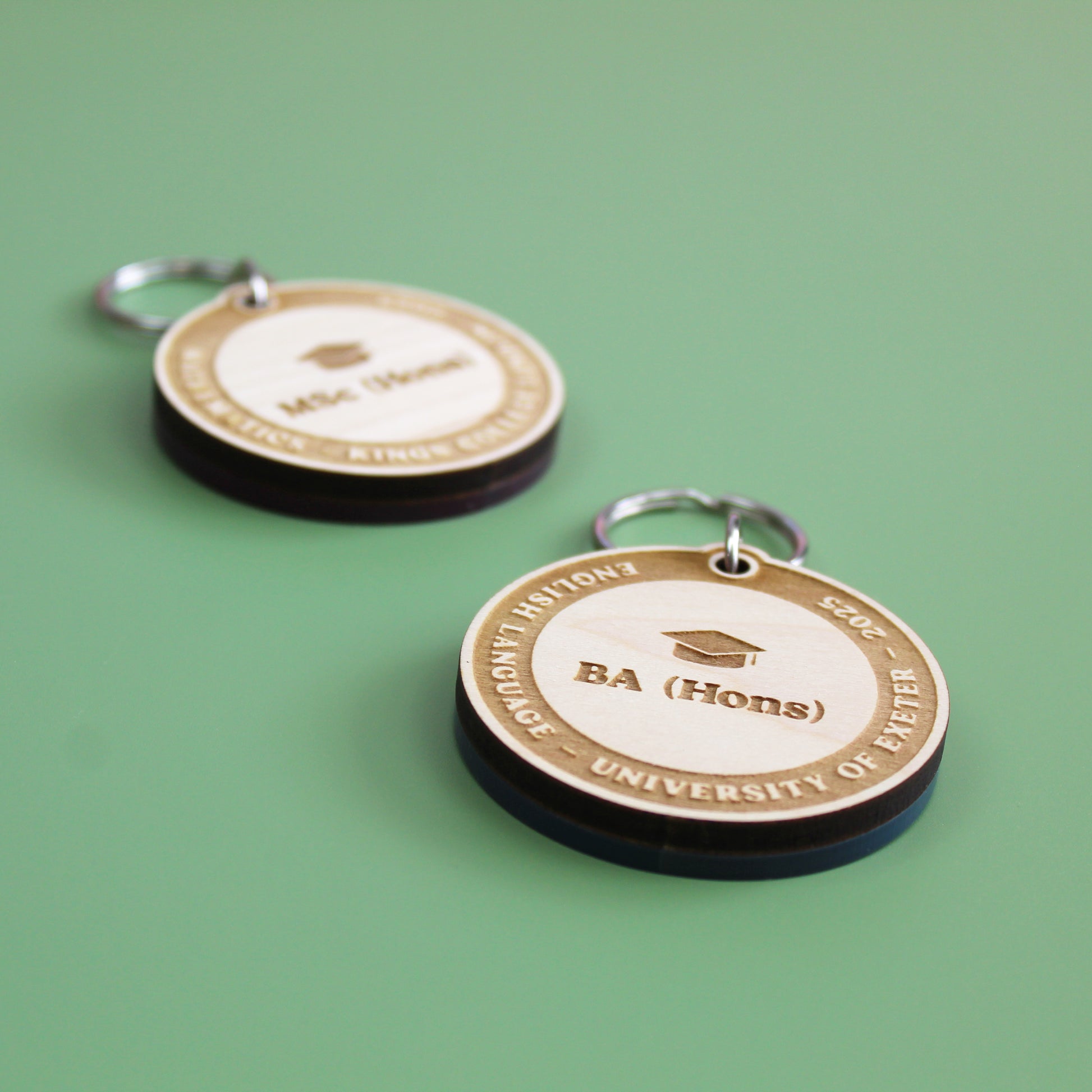 The keyring is engraved with the degree achieved in the centre, and can include the subject, the university and the year on the text engraved around the outside.