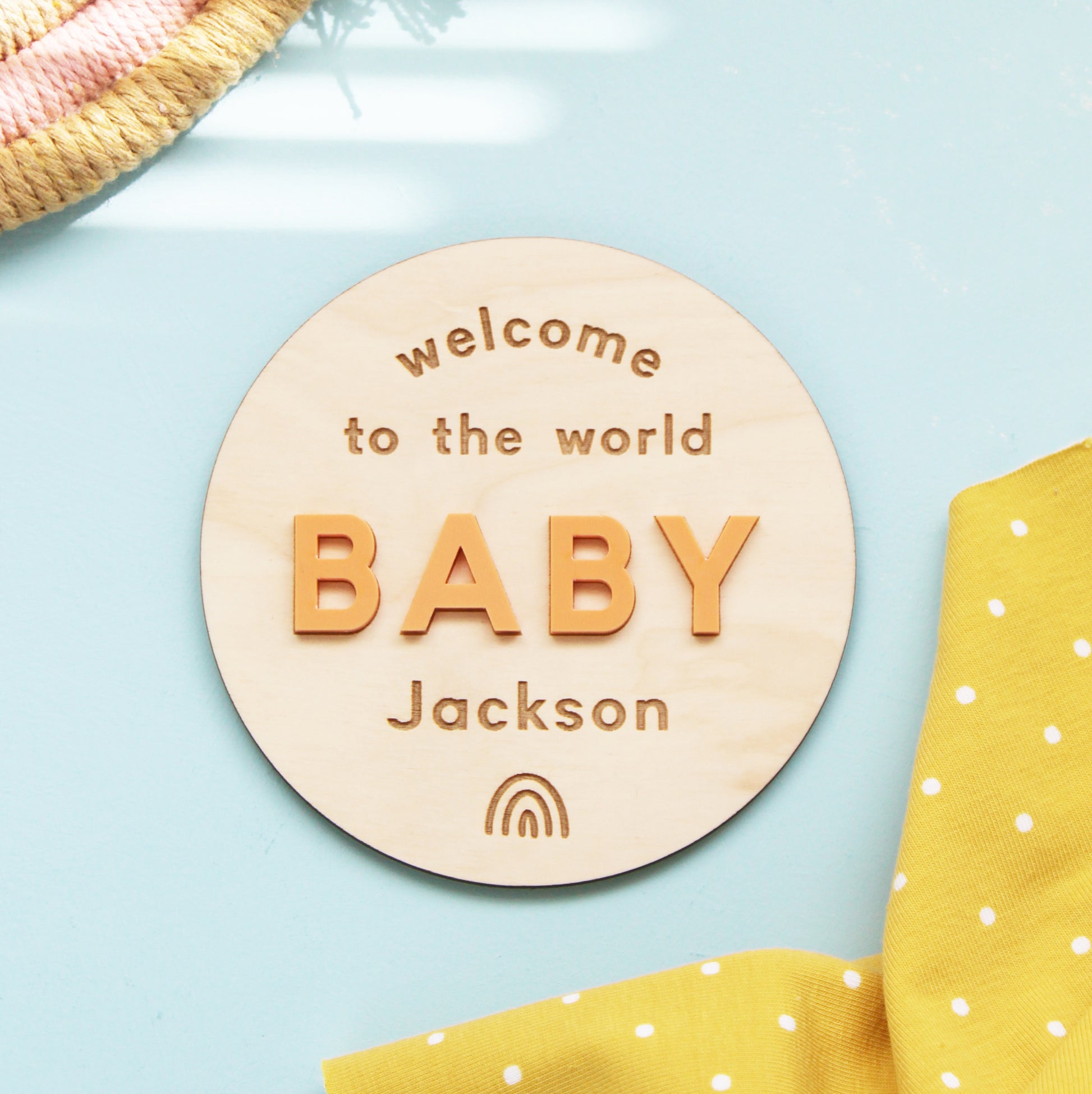 The disc is engraved with a name, and the word BABY is topped with acrylic letters in a choice of colours.
